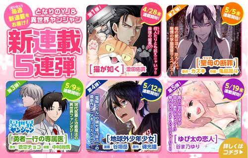 いつも「となりのヤングジャンプ」をご愛読いただきありがとうございます。新連載5作品が始まりました!チェック&応援よろしくお願いいたします! 「猫が如く」 澄田佑貴 ヤクザの親分は…猫!? 『茶虎組』の親分・オヤヂ。新入りヤクザの柳と組員は、今日も…