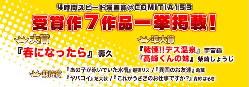 9/7(日)のCOMITIA153では「4時間スピード漫画賞」にたくさんのご応募いただき、ありがとうございました。受賞作が決定しましたので、お知らせいたします。(※各賞、ペンネーム50音順) 大賞(1作品) 「春になったら」壽久 準大賞(2作品) 「戦慄!!デス温…