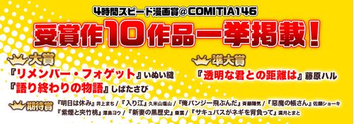12/3(日)のCOMITIA146では「4時間スピード漫画賞」にたくさんのご応募いただき、ありがとうございました。受賞作が決定しましたので、お知らせいたします。(※各賞、ペンネーム50音順) 大賞 『リメンバー・フォゲット』いぬい縫『語り終わりの物語』しば…